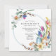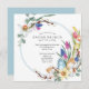 Bonita Páscoa Brunch convite com flores de primavera, ovos de verde e páscoa. Os arranjos florais assentam numa estrutura redonda em várias linhas e incluem daffodil, narciso, salgueiro, jacinto de uva de muscari, tulipas e folhas de eucalipto.