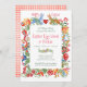 Um convite único e caprichoso para sua Páscoa Brunch, Picnic, Caça de Ovos ou junte-se! Motifs coloridos e alegres do estilo popular recebem primavera com flores, folhas, pássaros, borboletas e, claro, coelhos coelhos! Muito espaço para personalizar com todas as informações do seu partido; fácil de personalizar usando modelos de texto e menu de edição. O reverso da carta é um impressão de gingham rosa/coral giro. Arte original e design de Tuzi Williams.