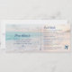 Um convite de casamento em um destino de praia tudo-em-um que se parece com uma passagem aérea de embarque, com uma seção que os convidados destacam e enviam de volta como um cartão-postal de confirmação de presença. Uma linda foto do pôr do sol no oceano em tons de azul-turquesa, pêssego e rosa está no fundo com um design sutil de folhas de palmeira. *Não é necessário envelope adicional para confirmação de presença para os convidados enviarem os cartões de volta. A parte do cartão de resposta auto-envio requer postagem mais barata de cartão-postal, economizando muito nos convites de casamento de praia casual. Eles ficarão com um "talão" de passagem para guardar com todas as informações importantes do seu casamento, incluindo detalhes de viagem ou hospedagem que aparecem no verso. Todas as partes deste modelo de convite de casamento de praia podem ser editadas, desde as fontes, cores do texto e posicionamento, basta clicar em 'personalizar mais' para usar o editor avançado. Entre em contato