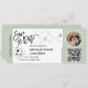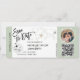 Passagem de Embarque para Casamento na Praia Destino Ticket de Avião Dourado Salve a Data com ícone de coração e avião com arte de linha minimalista simples mapa mundial e cor de fundo verde sage. Adicione seu código QR