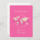 O emblema do mapa mundial rosa e roxo brilhante em um convite de cartão de passaporte plano para um chá de tema de viagem é simplesmente a maneira perfeita de convidar convidados para a diversão com a expressão "a aventura começa" que funcionará independentemente do estilo de decoração de chá que você usar. Use o editor avançado da Zazzle para alterar cores, fontes ou ajustar o posicionamento do texto para se adequar à quantidade de informações que você deseja incluir na página da foto do passaporte e no carimbo falso de aprovação do visto.