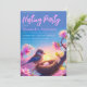 Um convite para um partido de ninho, um novo tipo de chá de fraldas. Na parte inferior há uma pintura representando um passarinho fofo e um ninho com um ovo, em um galho cor-de-rosa. Na metade superior está o texto, com a ocasião e o nome em cor-de-rosa, a ocasião na escrita. O fundo é azul. A ilustração do pássaro na ramificação florescente é gerada com a IA do Photoshop. Tenho o direito de utilizar as minhas gerações para qualquer fim legal, inclusive para uso comercial, e de as incorporar nas minhas obras.