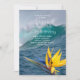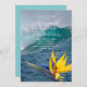 Pássaro do convite de aniversário de flores do paraíso com fundo de ondas grandes. Personalize para seu aniversário com fontes brancas impressas na parte superior das placas planas que têm opções de papel especiais. Água verde azul com espuma, ondas de choque e uma flor tropical amarela realista no fundo.