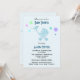 Um convite para chá de fraldas azul de pó giro. Um pássaro azul se senta sobre uma carruagem de bebê azul que cuida de seu filhinho. Uma casal de bolinhas divertidas à volta da carruagem do bebê. Personalize com os detalhes do seu próprio partido.
