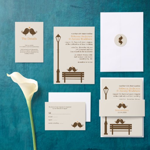 Convites de casamento quentes e bonitos apresentam uma ilustração romântica de dois pássaros amados tocados num banco de parque. Arte de Babystar Design.
