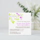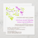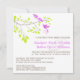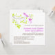 Essa elegante e romântica design apresenta duas aves violetas violetas brilhantes em um delicado galho com folhas de verde limão. O texto está em castanho com os nomes da noiva e do noivo em roxo que corresponde aos pássaros no galho.