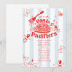 Pasta and Pacifiers baby shower theme featuring red doodle inspired illustrations of spaghetti, basil, and bow tie pasta over light blue striped background.