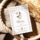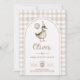 Celebre o dia especial do seu pequeno com este charmoso convite de aniversário de "Pato Sortudo"! Apresentando uma ilustração esbranquiçada de um pato afiador vestindo um chapéu de festa e segurando um balão marrom pastel, este design é enquadrado por uma fronteira clássica de xadrez bronzeada para um toque de elegância retrorreflectora.