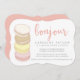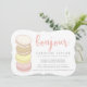 Oh la la! Estes cartões de convite pastel super-femininos são perfeitos para uma doce festa de aniversário francesa ou parisiense de dezesseis anos! Cartões em forma exclusiva apresentam uma pilha de biscoitos macarônicos deletáveis em tons pastéis de rosa, amarelo, marfim e bronzeado, com "Bonjour" na parte superior, em um roteiro estilo manuscrito cor-de-rosa. A placa se reverte para cor-de-rosa pincelado sólido.