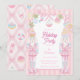 This holiday party invitation features two pink and blue nutcrackers with cupcake hats on a sweet treat border. You can personalize this invitation with your event details in pink text. The back has a coordinating pattern with cookies, candy and holiday treats.