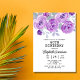 Honra uma mulher especial com este Convite de aniversário elegante e feminino. Este elegante design apresenta flores rosa púrpuras de aquarela com folhas de cinza macia. Cada texto é personalizável para suas necessidades.