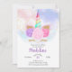 Este convite de aniversário sonhador, pastel, apresenta um fundo de aquarela, uma estrutura geométrica dourada e um elegante e sonolento unicórnio.
