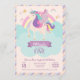 Celebre o aniversário mágico do seu amante de unicórnios com este belo convite! Projetado com um unicórnio fofo com cores doces e pastel do arco-íris, faíscas e brilhos (simulados apenas), este convite trará um tema maravilhoso para o grande dia!