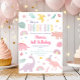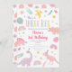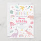 Este adorável convite de aniversário apresenta dinossauros desenhados à mão, arco-íris e folhas em cores pastéis.