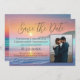 Salve o Cartão de Casamento de Data com lindas cores pastéis elegantes do pôr do sol na praia. As cores azul-turquesa, púrpura e laranja sunset ombre criam uma espantosa mistura de tons tropicais para um tema de casamento de praia, oceano, cruzeiro ou pôr do sol. Excelente ideia para planejar uma cerimônia de casamento na praia do paraíso em um resort em uma ilha com esta adorável design. Silhueta de montanha, sol nascente ao anoitecer, com ondas suaves e areia de praia na costa oceânica, perfeito para um destino, ilha, evento marítimo do paraíso tropical e costeiro. Compartilhe seu casamento litorâneo com hawaii, califórnia, ilha caribe ou praia tropical.