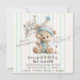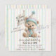 Celebrate a little one's milestone with this charming birthday invitation featuring a pastel-striped background, gold star accents, and an adorable teddy bear in party attire. Whimsical and warm, this design sets the tone for a joyful first birthday celebration filled with games, treats, and festive cheer.