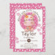 Convites de aniversário de picada de horta com bolinhas brancas e corações cor-de-rosa.