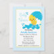 Um convite de chá de fraldas neutro em termos de gênero apresenta um pato amarelo com um guarda-chuva de bolinhas azul esmaltado numa poça de água. A borda tem bolinhas azuis com trim amarelo e a parte traseira repete o padrão de bolinhas azul suave. Alguns elementos por PrettyGrafik Design.