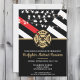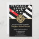 Este design apresenta uma bandeira de bombeiros com listras pretas e brancas, e uma fina faixa vermelha também. Um crachá de bombeiro está sentado acima de todos os detalhes da festa para o bombeiro graduado. Esta design também trabalha excelente para um bombeiro aposentado, tenente, ou festa de aposentadoria do chefe.