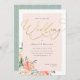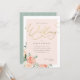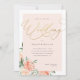 Trendy floral convite para o casamento, que inclui peões de cor de pêssego e creme e verde-azul, com um falso guião de folha de ouro contra uma camada cor-de-rosa. Seus detalhes de casamento aparecem em uma simples tipografia na moda.