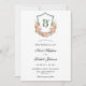 Este belo convite de casamento floral de pêssego com a noiva e as iniciais do noivo seria perfeito para o seu casamento. É tradicional, mas moderna, e as fontes são requintadas. As flores de cor d'água de pêssego e o verde sábia estão chocantes juntos.