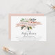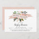 Chá de panela chic apresenta uma fita cor-de-rosa pincelada com as palavras "chá de panela" com flores de pêssego e folhas verdes espiando. Personalize com os detalhes do seu chá de panela em letras negras pouco claras, com o nome da noiva em um elegante roteiro de caligrafia estilo escrito à mão.