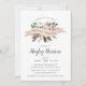 Os convites de chá de panela florais elegantes apresentam flores cor-de-rosa pinceladas escamosas e folhas verdes emoldurando uma faixa cor-de-rosa esbranquiçada lendo "chá de panela". Personalize com os detalhes do seu chá de panela abaixo em uma mistura de blocos, serifas e tipos de caligrafia.