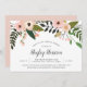 Chá de panela chic apresenta uma borda superior de produtos botânicos verdes em cascata pontilhados com pêssego e flores e botões cor-de-rosa pincelados. Personalize com os detalhes do seu chá de panela em letras negras pouco claras, com o nome da noiva em um elegante roteiro de caligrafia estilo escrito à mão.