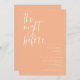 Um convite minimalista de janto de ensaio de casamento com uma letra moderna que diz "na noite anterior". A cor de fundo é o pêssego.