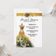Uma bela pluma de penas de ouro de pavão repousa sobre uma falsa banda de ouro que tem espirais decorativas de ambos os lados. Abaixo da banda estão modelos pretas personalizadas e um belo vestido de noiva feito de seda de ouro fina e penas de pavão que se pop contra o fundo branco estrelado. Este convite "chá de panela" é ideal para qualquer evento muçulmano, islâmico, hindu, hindu, indiano; natureza, ave ou ao ar livre.