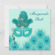 Máscara de mascarada com penas de pavão. Sombras de blues, verdes e turquesas. Personalize a cor do papel, o tipo de evento, o estilo da fonte e as cores da fonte.