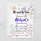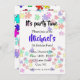 Convite de peças de quebra-cabeças coloridas. Quebra-cabeças coloridos em um fundo branco, nome da criança em azul brilhante. Peças do quebra-cabeça nas cores azul, amarelo, verde, rosa, vermelho e azul, tornando este design perfeito para meninas e meninos