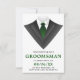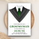 Convide seus padrinhos com este cartão de pedido moderno com um smoking clássico e gravata verde contra um fundo branco. Basta adicionar os detalhes do evento neste modelo fácil de usar para torná-lo um convite único. Vire o cartão para revelar um padrão de listras pretas e brancas no verso do cartão.