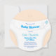 Um convite para o chá de fraldas com uma fralda de bebê num bebê com um tom de pele leve. O texto e o pino de segurança da fralda são azuis. Todas as palavras são personalizáveis. O tom de pele de fundo pode ser personalizado.