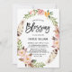 Convite para bênção de bebê inspirado em Boho, com penas de aquarela e flores coradas com cor rosa-de-costas. Elegante e caprichoso, perfeito para bençãos primavera. Personalize adicionando nomes, data, hora, local e outros detalhes do evento.