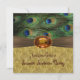 Convite de festas Elegante Sweet 16 com penas azul verde e penas de pavão dourado, padrões decorados com imagens impressas de âmbar e fita. Você pode alterar o texto de acordo com suas necessidades.
