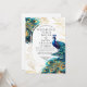 Um convite para casamento de na moda moderno com um pavão elegante. Ouro azul verde e turquesa com linha dourada, escrita clássica, caligrafia elegante e minimalista (imitação do pó prateado e do ouro). Um belo e elegante convite de casamento, simples e moderno.