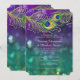 Correspondência entre o convite de festas do Chá de Janto de ensaio e os produtos complementares. Quer um convite elegante e festivo para a festa de Penas de Pêssego que seja elegante e bonito? Esta design é feita com penas pavão, à água, adornadas com joias de diamante gráficas (NOTA: trata-se de um convite impresso plano, não existem joias reais, brilho dourado, folha metálica ou tinta metálica utilizadas) sobre um brilho profundo e rico do boque, luzes cintilantes em fundo profundo, roxo rico, azul, aqua e verde. O lado inverso é o plano de fundo das luzes delimitadoras que coincidem com o quadro. Altere facilmente o texto usando os campos modelo fornecidos. Eterno, estilo clássico tradicional com uma reviravolta moderna para uma elegância de gravata negra.