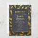 Um convite de aniversário de estilo de deco de arte chic. Um padrão bonito - fundo preto com penas de ouro rico flutuando para baixo. Design de na moda sofisticado. No centro, uma textura preta, aflita, com borda dourada, é colocada sobre o padrão da pena. Personalize com os detalhes do seu partido.