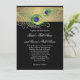 "Penas Douradas em Black Modern Jewel Swirl Wedding Suite." Um par de penas de pavão pintadas a aquarelas com fundo de ouro escovado e destaques de espirais de joias de diamante dá um tom de glama moderno, sofisticado para o seu casamento. Arte de uma artista e designer internacionalmente licenciada, Audrey Jeanne Roberts, copyright.