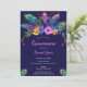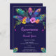Belo e elegante pavão roxo e pavão de penas Quinceañera Convite. Penas de pavão e design floral de púrpura, azul, verde e pinks fazem um convite muito especial para o Partido Quinceañera da sua filha. Fácil de personalizar com suas informações. Perfeito para aqueles que amam penas e flores de pavão, contra um fundo roxo escuro, uma forma única de comemorar seu aniversário de 15.