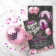 © Socialite Design Inc. & LICENSORS. Celebre uma festa de aniversário de discoteca convidando os convidados com este convite de aniversário de discoteca rosa e divertido. As cores são cor-de-rosa, branca e cinzas. O design incorpora uma bola de disco rosa fuchsia e luzes de cordas brancas / douradas como fundo. Os design incluem também um vestido cor-de-rosa, calçados rosas de pedra, uma bolsa rosa, um registro rosa e um balão cor-de-rosa. Personalize este convite divertido para a sua celebração especial.