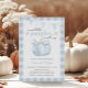 Celebre a chegada do seu bebê com o nosso encantador convite ao Chá de fraldas "Doce Pequena Abóbora". Projetado com matizes de pastel azul macio e delicadas bordas de gingham, este convite apresenta uma adorável abóbora de aquarela embrulhada num arco de cebola azul, capturando perfeitamente o calor e a alegria de uma celebração com o tema do outono. Fontes elegantes e sotaques lúdicos anunciam o dia especial no estilo, enquanto o estoque de cartolina de alta qualidade garante uma sensação premium aos seus convidados. Quer você esteja hospedando uma festa de chá aconchegante ou uma reunião rústica, este convite dá o tom para um evento sensato e memorável. Que seus entes queridos saibam que uma doce abóbora está a caminho com um convite que é tão precioso quanto a celebração em si!