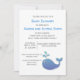Pequena baleia branca / pequeno convite para chás de fraldas de casal azul e branco. A parte de trás do convite é coberta por pequenas baleias azuis.