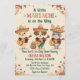 Este convite de chá de bebê encantador apresenta a frase "Um Pequeno Mariachi está a Caminho" e três adoráveis animais (uma lhama, um burro e um cachorro) usando coloridos sombreros e tocando violões.