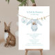 Tema do chá de fraldas de páscoa com ilustração inspirada em vintage de um traje de Páscoa com coelho da Páscoa em caminhão, Páscoa gingham bib e meias de bebês de cenoura penduradas na linha de vestidos. O convite tem esquema de cor azul.
