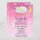 Uma doce garotinha caucasiana dormindo em uma nuvem cercada por corações e estrelas, convites cor-de-rosa para bebês.