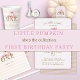 Um convite bonito, doce e na moda para uma festa de primeiro aniversario de bebê, com tema de abóbora rosa, perfeito para o Halloween ou a queda, a colheita etc. Apresenta uma pintura aquosa de uma abóbora rosa com um arco rosa, rosas cor-de-rosa, assim como algumas folhas de outono. A parte de trás é colocada com uma simples textura cor-de-rosa esbranquiçada e uma faixa de abas de porão que corresponde à tipografia e à caligrafia.