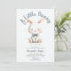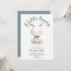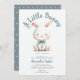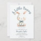 Uma ilustração encantadora de aquarela com um coelho precioso vestindo um gravata arco decora este delicado convite para o chá do bebê com um esquema de cor azul e branco empoeirado, que é um ajustado perfeito para uma celebração de primavera, eventos de Páscoa, um fête de jardim de verão ou um encantador chá de fraldas de piquenique.