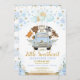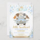 Este adorável convite apresenta balões azuis e dourados em forma de coração e animais de floresta bonitos em um carro azul giro